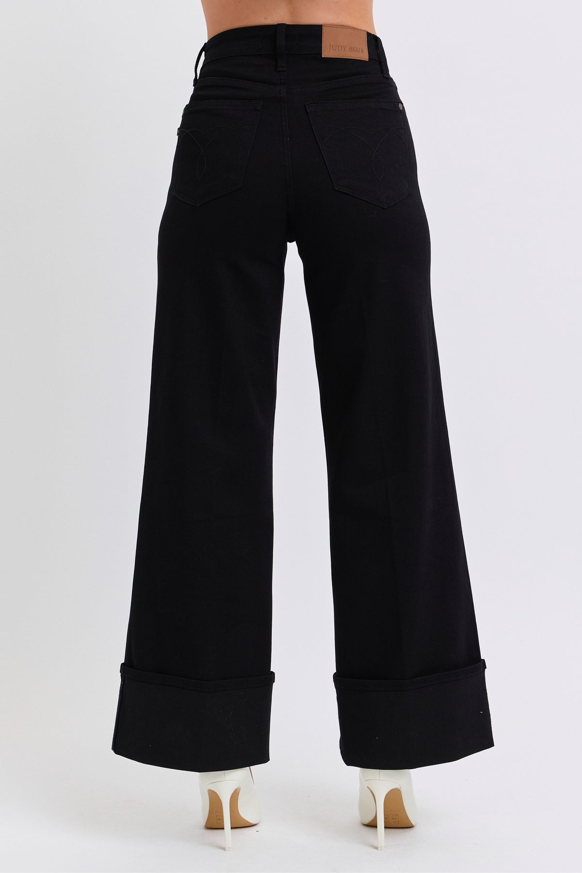Step into a throwback vibe with these Judy Blue High Rise Cuffed Wide Leg Jeans. Crafted from black denim, their retro wide-leg cut and high-rise fit bring a fun, flirty twist to your everyday look. The cuffed hems add a playful edge, perfect for dancing through your day with style and comfort.